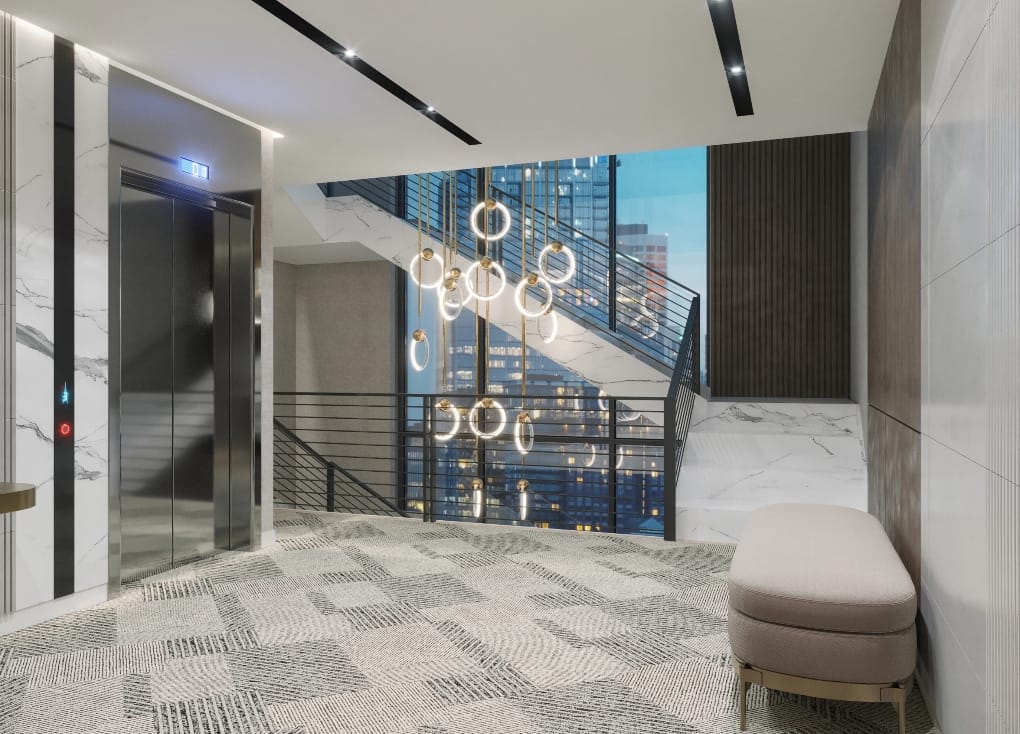 The interiors reflect contemporary and innovative design concepts, creating a modern atmosphere that is both calming and inviting. Multiple private balconies for each unit stylistically and functionally extend the living space to the outdoors, with wrap-around views of the Bull City.